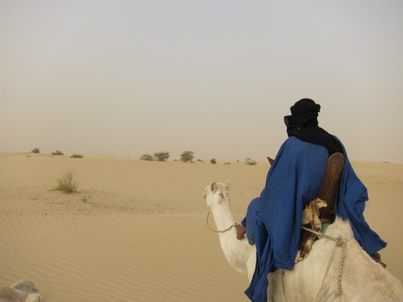 To gather sensory information about Barth’s travels, I wanted to spend a day on a camel in the desert. Shindouk arranged it. One morning a Tuareg wearing blue robes and a long sword showed up at the hotel’s gate. Somber and unsmiling, he was riding a white mehari and leading another. His name was Agali ag-Mohamed, Ali for short. Shindouk told me was a Kel Ulli, a tribe in the Imrad class of Tuaregs.