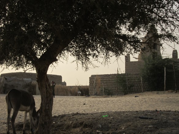 Some things about the road haven’t changed. It’s still a sun-baked straight line from river to town. Alongside it, people still rest in slivers of shade cast by stunted trees. Donkeys and their keepers still move briskly between the Niger and Timbuktu. Heading towards the port, the donkeys carry nothing. Heading towards town, they nearly disappear beneath their wide loads of millet stalks or river grass, sold for fodder in the markets.