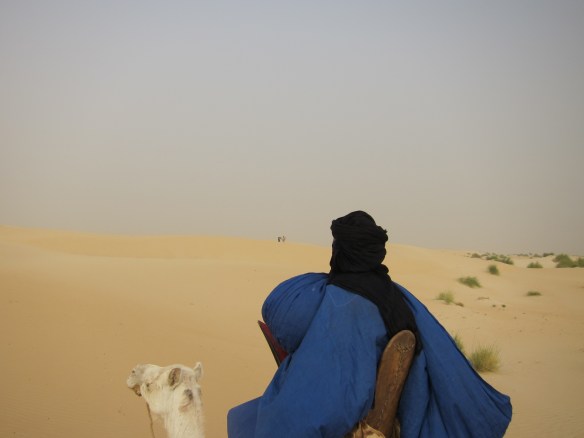 To gather sensory information about Barth’s travels, I wanted to spend a day on a camel in the desert. Shindouk arranged it. One morning a Tuareg wearing blue robes and a long sword showed up at the hotel’s gate. Somber and unsmiling, he was riding a white mehari and leading another. His name was Agali ag-Mohamed, Ali for short. Shindouk told me was a Kel Ulli, a tribe in the Imrad class of Tuaregs.